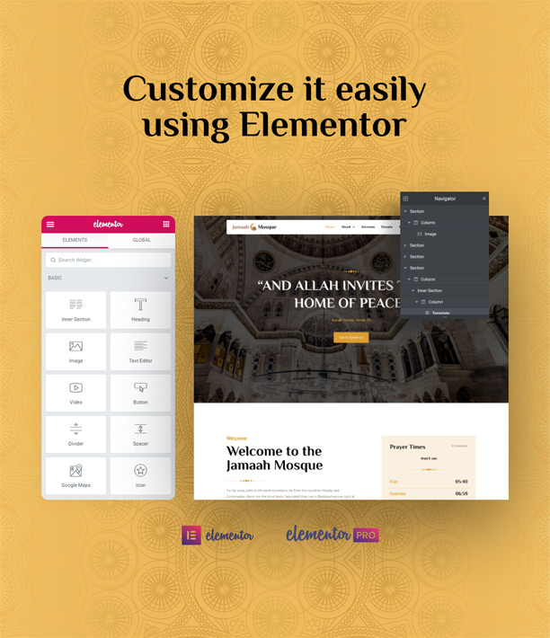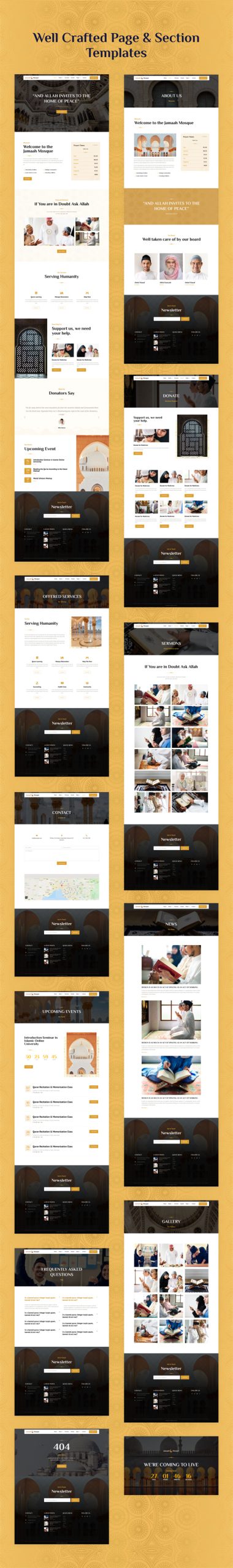 Semua halaman dan bagian dalam paket template Elementor Jamaah dirancang secara profesional. Mulailah membangun kehadiran online untuk masjid Anda sekarang juga dan mulailah menyebarkan ajaran Islam yang indah.
