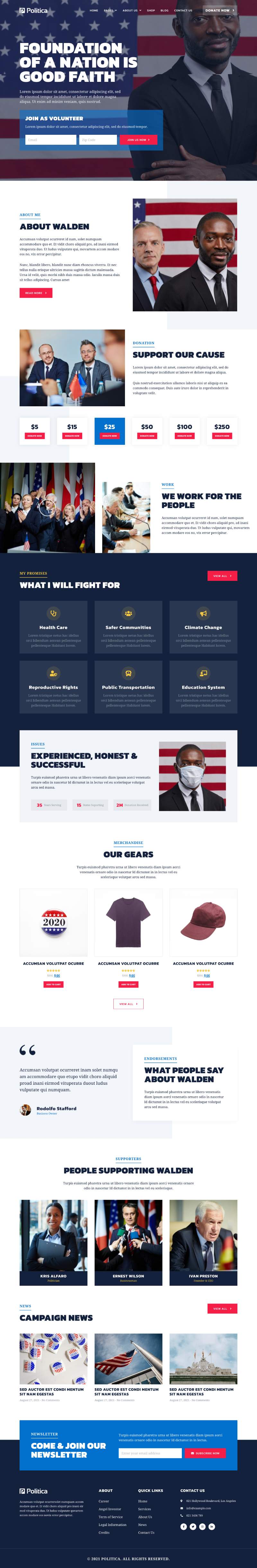 Politica adalah paket template Elementor yang membantu Anda menciptakan kehadiran online untuk politisi, senator, pegawai negeri, dan pejabat pemerintah menggunakan WordPress dan Elementor. Paket ini sudah dilengkapi dengan dukungan WooCommerce, di mana Anda juga dapat menjual merchandise kampanye Anda.